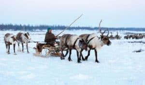 Reindeer driven sleds are a popular means of transportation on the snow-covered plains of northwestern Siberia.