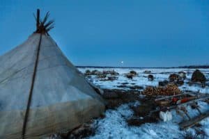 A nomadic group in northwestern Siberia pack their sleds to move farther north for the summer.